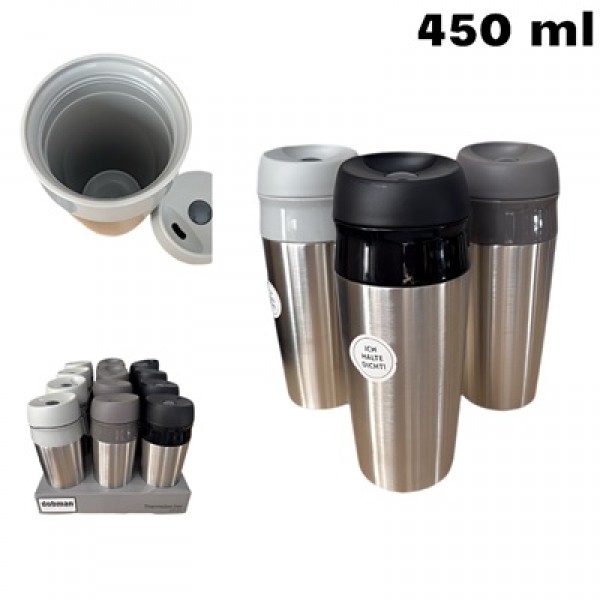 Thermobecher Edelstahl 450 ml in 3 FarbenDoppelwandiger Trinkbecher aus Edelstahl. Innenbeschichtung und Deckel aus PP.