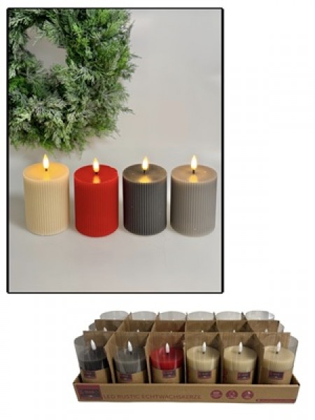 Kerze mit Rillen LED Echtwachs Ø 7,5 x 12,5 cm, flackernd mit Timer in 4 FarbenRustic-Kerze mit Rillenrelief