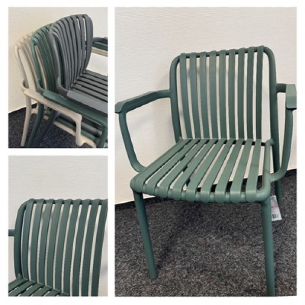 Stuhl mit Armlehne aus Kunststoff, grün (nur auf Containerbasis)Die Farbe des Stuhls ist ein matt gedeckter Grünton.