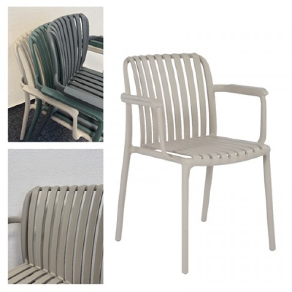 Stuhl mit Armlehne aus Kunststoff, hellgrau (nur auf Containerbasis)Die Farbe des Stuhls ist eher matter Beige-Sandton.